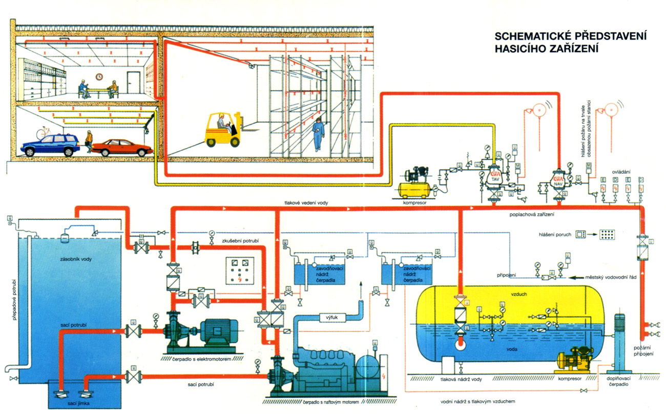 Jednou z nejdůležitějších součástí sprinklerového systému je zdroj vody stávající se ze zásobníku vody a hlavních sprinklerových čerpadel. Tato čerpadla mohou být v provedení s pohonem pomocí diesel motoru nebo elektro motoru. Ideální kombinací pro maximální bezpečnost a spolehlivost je kombinace dvou čerpadel – jedno s elektromotorem a druhé s diesel motorem. Výkonové parametry čerpadel se kontrolují na testovacím potrubí.